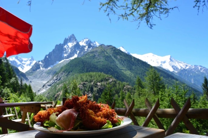 For fans of cheese La Crèmerie du Glacier will be your Mecca. A characterful wooden cabin down in the valley near Argentière, the menu features croutes and fondues made with the local cheeses. There are many other traditional dishes too, all delicious. Plenty of seating outside.